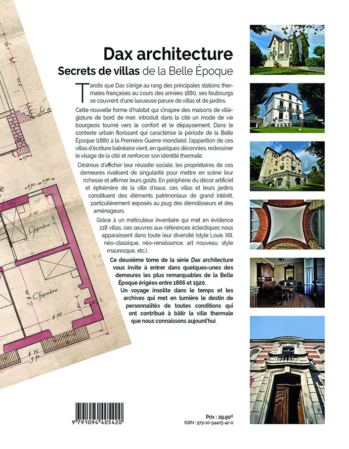 [ Impression couleur ] [ Parution 25 mai 2021 ] [ Prix 29,90€ ] [ Isbn 979-10-94405-42-0 ] Tandis que Dax s’érige au rang des principales stations thermales françaises au cours des années 1880, ses faubourgs se couvrent d’une luxueuse parure de villas et de jardins. Cette nouvelle forme d’habitat qui s’inspire des maisons de villégiature de bord de mer, introduit dans la cité un mode de vie bourgeois tourné vers le confort et le dépaysement. Dans le contexte urbain florissant qui caractérise la période de la Belle Époque (1880 à la Première Guerre mondiale), l’apparition de ces villas d’écriture balnéaire vient, en quelques décennies, redessiner le visage de la cité et renforcer son identité thermale. Désireux d’afficher leur réussite sociale, les propriétaires de ces demeures rivalisent de singularité pour mettre en scène leur richesse et affirmer leurs goûts. En périphérie du décor artificiel et éphémère de la ville d’eaux, ces villas et leurs jardins constituent des éléments patrimoniaux de grand intérêt, particulièrement exposés au joug des démolisseurs et des aménageurs. Grâce à un méticuleux inventaire qui met en évidence près de 200 villas, ces oeuvres aux références éclectiques nous apparaissent dans toute leur diversité (style Louis XIII, néo-classique, néo-renaissance, art nouveau, style mauresque, etc.). Ce second tome de la série Dax Architecture vous invite à entrer dans quelques-unes des plus remarquables demeures de la Belle Époque érigées entre 1880 et 1919. Un voyage insolite dans le temps et les archives qui met en lumière le destin de personnalités de toutes conditions qui ont contribué à bâtir la ville thermale que nous connaissons aujourd’hui.
