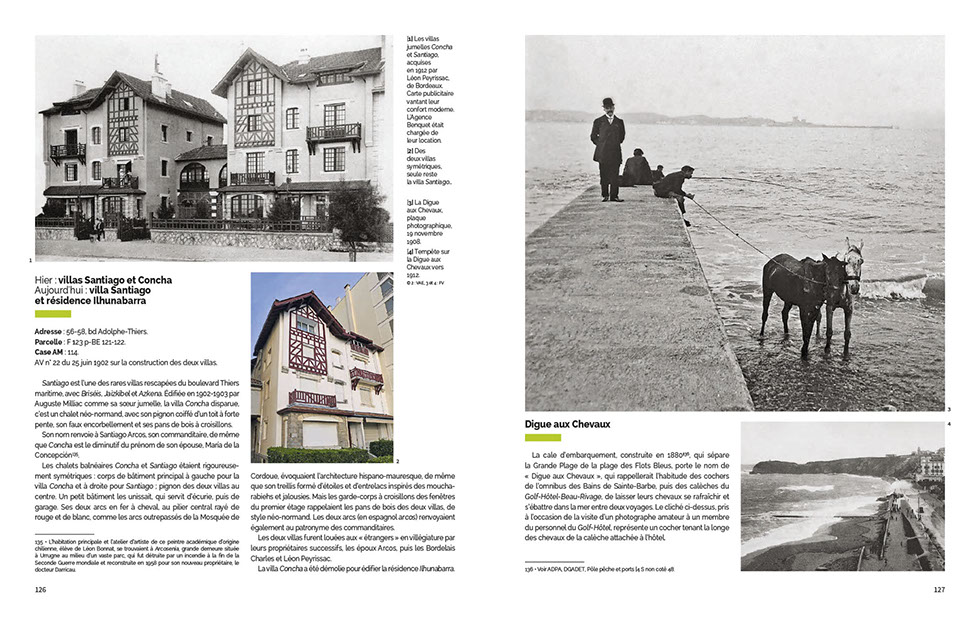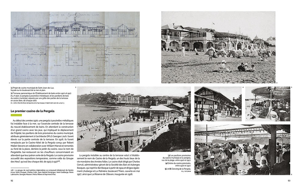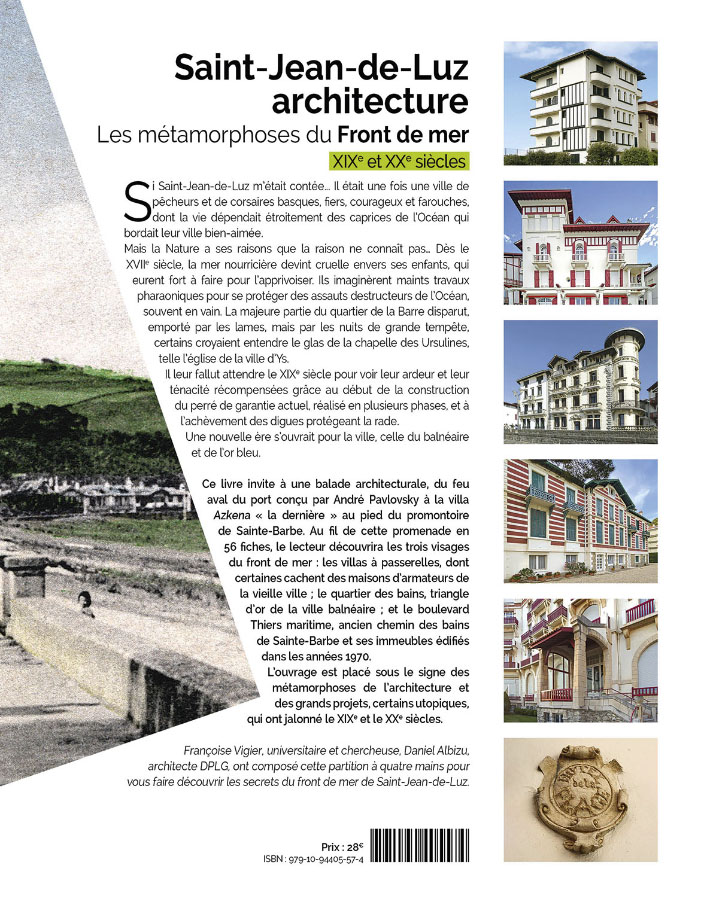 Cliquez, imprimez, envoyez ! [ Auteurs Françoise Vigier - Daniel Albizu ] [ Format 21 cm x 27 cm ] [ Pages 160 ] [ Photographies 295 ] [ Couverture souple avec rabats ] [ Impression couleur ] [ Parution novembre 2023 ] [ Prix 28€ ] [ Isbn 979-10-94405-57-4 ] Si Saint-Jean-de-Luz m’était contée... Il était une fois une ville de pêcheurs et de corsaires basques, fiers, courageux et farouches, dont la vie dépendait étroitement des caprices de l’Océan qui bordait leur ville bien-aimée. Mais la Nature a ses raisons que la raison ne connaît pas… Dès le XVIIe siècle, la mer nourricière devint cruelle envers ses enfants, qui eurent fort à faire pour l’apprivoiser. Ils imaginèrent maints travaux pharaoniques pour se protéger des assauts destructeurs de l’Océan, souvent en vain. La majeure partie du quartier de la Barre disparut, emporté par les lames, mais par les nuits de grande tempête, certains croyaient entendre le glas de la chapelle des Ursulines, telle l’église de la ville d’Ys. Il leur fallut attendre le XIXe siècle pour voir leur ardeur et leur ténacité récompensées grâce au début de la construction du perré de garantie actuel, réalisé en plusieurs phases, et à l’achèvement des digues protégeant la rade. Une nouvelle ère s’ouvrait pour la ville, celle du balnéaire et de l’or bleu. Au fil de cette promenade en 56 fiches, le lecteur découvrira les trois visages du front de mer : les villas à passerelles, dont certaines cachent des maisons d’armateurs de la vieille ville ; le quartier des bains, triangle d’or de la ville balnéaire ; et le boulevard Thiers maritime, ancien chemin des bains de Sainte-Barbe et ses immeubles édifiés dans les années 1970. Cliquez, imprimez, envoyez ! [ Auteurs Philippe Dulau - Jérôme Zapata ] [ Photographe Emmy Martens ] [ Format 21 cm x 28 cm ] [ Pages 96] [ Photographies 176 ] [ Couverture souple avec rabats ] [ Impression couleur ] [ Parution 20 mai 2022 ] [ Prix 22€ ] [ Isbn 979-10-94405-51-2 ] L’armistice de 1918 met fin aux combats de la Première Guerre mondiale. Peu après s’amorce une période d’intense activité sociale, culturelle et artistique portée par une jeunesse enivrée d’espoir qui souhaite s’amuser, vivre et surtout oublier les horreurs de la « Der des ders ». Chaque année, entre les mois d’août et octobre, cette élite mondialisée et cosmopolite fait de la Côte basque son terrain de jeu. Effréné est le rythme des fêtes somptueuses et des soirées sans fin qui s’égrènent au son des notes chaudes et cuivrées du jazz. Parmi la cohorte d’industriels, patrons de presse, princes déchus et autres amerikanoak présents chaque été, certains, désireux de disposer d’un pied-à-terre, vont alors faire appel aux architectes et artisans locaux les plus en vue. Ceux-ci, en fonction du budget dont ils disposent et du goût du commanditaire, élèvent des bâtisses dans un style tantôt régionaliste, tantôt moderne, on ne parle pas encore d’Art déco. Il arrive parfois que ces constructions mirifiques soient situées à la croisée des deux mouvances. Le choix du Noir et Blanc L’emploi du monochrome par la photographe Emmy Martens offre ici un répertoire de formes lisibles et dirige le lecteur vers l’essentiel du propos de l’image : les formes, les lignes, les textures et les reliefs. Cette approche radicale permet de se concentrer sur le sujet du livre. Cliquez, imprimez, envoyez ! [ Auteur Kévin Laussu ] [ Préface Dominique Jarrassé ] [ Format 21 cm x 27 cm ] [ Pages 192] [ Visuels 575 ] [ Couverture souple avec rabats ] [ Impression couleur ] [ Parution 2 mai 2020 ] [ Prix 29,90€ ] [ Isbn 979-10-94405-30-7 ] De la démolition des remparts antiques à l’avènement du thermalisme médical, des hôtels aux luxueuses villas, ce guide historique et architectural retrace l’ensemble des politiques urbaines et réalisations majeures qui ont façonné le visage de la ville thermale que nous connaissons. Tandis que Dax vient d’obtenir en décembre 2019 le prestigieux label Ville d’Art et d’Histoire, cette publication scientifique constitue un outil documentaire qui aidera à mieux identifier et décrypter les trésors architecturaux de la cité. Ville d’eaux réputée depuis l’Antiquité, Dax connaît à partir des années 1850 un essor architectural et urbain sans précédent. Tandis que l’on assiste à l’avènement d’un véritable thermalisme médical, de ravissants hôtels, établissements de bains, commerces et immeubles de rapport, sortent de terre. Cité de l’éphémère et du divertissement, lieu de mondanité et de représentation : la station thermale est un espace urbain atypique qui admet ses propres règles et institutions. Perpétuellement en transformation, elle rivalise de luxe et de nouveautés pour séduire la riche clientèle qui fréquente chaque année les grandes villes d’eaux européennes. Entre 1880 et 1919, plus de deux cents villas sont édifiées dans les faubourgs de Saint-Vincent et de Saint-Pierre. La construction de ces habitations modernes, dont l’architecture pittoresque et éclectique est marquée par l’identité stylistique des établissements thermaux, est le phénomène le plus marquant de cette ère de prospérité. Le voyageur, qui découvre de nos jours la cité, aura bien du mal à retrouver dans le paysage actuel les splendeurs architecturales qui ont fait sa notoriété avant la Grande Guerre. À quoi ressemblait-elle en ce temps-là ? Que reste-t-il de ce glorieux passé balnéaire ? Cliquez, imprimez, envoyez ! [ Auteur Kévin Laussu ] [ Format 21 cm x 27 cm ] [ Pages 200] [ Visuels 450 ] [ Couverture souple avec rabats ]