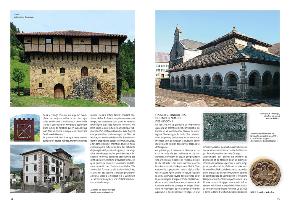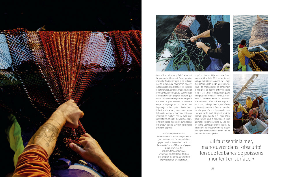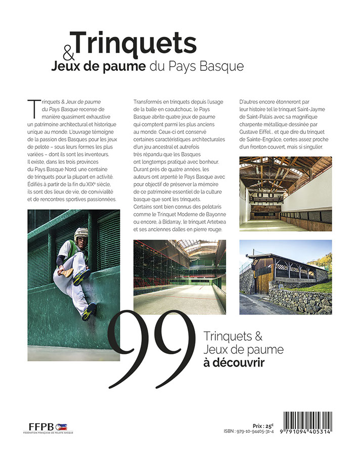 [ Auteures Delphine Le Corff Ricau - Anne-Sophie Susperregui ] [ Format 24 cm x 30 cm ] [ Pages 184] [ Visuels 304 ] [ Couverture Cartonnée rigide avec jaquette ] [ Impression couleur ] [ Parution novembre 2021 ] [ Prix 32€ ] [ Isbn 979-10-94405-48-2 ] La profession de marin-pêcheur est fortement ancrée dans le patrimoine culturel maritime du Pays basque. La filiation y est si fortement imprégnée, que l’on nourrit à son encontre de nombreux mythes souvent éloignés de la réalité. Certaines pratiques ont pu induire une vision manichéenne de la profession alimentée par une montée en puissance de notre conscience écologique. La pêche est plurielle. Il n’existe pas une typologie récurrente et linéaire de la profession mais une pluralité de pratiques et de métiers. Il n’y a pas une pêche mais des pêches comme il n’y a pas un pêcheur mais des pêcheurs. Cliquez, imprimez, envoyez ! [ Auteur Kepa Etchandy ] [ Format 21 cm x 30,5 cm ] [ Pages 176] [ Visuels 270 ] [ Couverture souple avec rabats ] [ Impression couleur ] [ Parution 16 novembre 2020 ] [ Prix 28€ ] [ Isbn 979-10-94405-41-3 ] "Au Pays des Basques" est le reflet de quelques-uns des nombreux tours et détours de l’auteur ; une plongée au Pays des Basques, un tout petit territoire riche de sa diversité géographique ; une immersion dans sa culture, ses coutumes et sa langue, supports de son identité. Le voyage proposé commence à la nuit des temps et vous conduira jusqu’à nos jours. Il est empreint de signes parfois millénaires. Le lecteur flânera aux quatre coins de l’Euskal Herri, de la côte rocheuse battue par les flots aux sommets enneigés fréquentés par les bergers et les randonneurs. Il déambulera au cœur du « potager » navarrais pour atteindre les canyons de Haute-Soule. Au fil de cette découverte, s’imposeront des châteaux, des lieux de culte insoupçonnés ou encore la fameuse maison basque, l’etxe, port d’attache de tout un peuple. Puis, dans l’une de ces magnifiques villes ou l’un de ces pittoresques villages, le lecteur posera alors inévitablement son coude sur un comptoir riche des saveurs venues des sept provinces. Il sera embarqué sur les mers par des pêcheurs et des marins découvreurs, c’est ainsi que s’ouvriront à lui les lointaines Amériques où de nombreux Basques ont si souvent planté leurs racines… Cliquez, imprimez, envoyez ! [ Auteurs Michel d'Arcangues - Sébastien Husté ] [ Préface Lilou Echeverria - Yves Carlier] [ Format 21 cm x 27 cm ] [ Pages 192 ] [ Couverture souple avec rabats ] [ Impression couleur ] [ Parution 20 avril 2019 ] [ Prix 25€ ] [ Isbn 979-10-94405-31-4 ] «Trinquets et Jeux de paume du Pays basque» recense de manière quasiment exhaustive un patrimoine architectural et historique unique au monde. L’ouvrage témoigne de la passion des Basques pour les jeux de pelote – sous leurs formes les plus variées – dont ils sont les inventeurs. Il existe, dans les trois provinces du Pays basque nord, une centaine de trinquets pour la plupart en activité. Édifiés à partir de la fin du XIXe siècle, ils sont des lieux de vie, de convivialité et de rencontres sportives passionnées. Transformés en trinquets depuis l’usage de la balle en caoutchouc, le Pays basque abrite trois jeux de paume qui comptent parmi les plus vieux au monde. Ceux-ci ont conservé certaines caractéristiques architecturales d’un jeu ancien et autrefois très répandu que les Basques ont longtemps pratiqué avec bonheur. Durant près de quatre années, les auteurs ont arpenté le Pays basque avec pour objectif de préserver la mémoire de ce patrimoine essentiel de la culture basque que sont les trinquets.